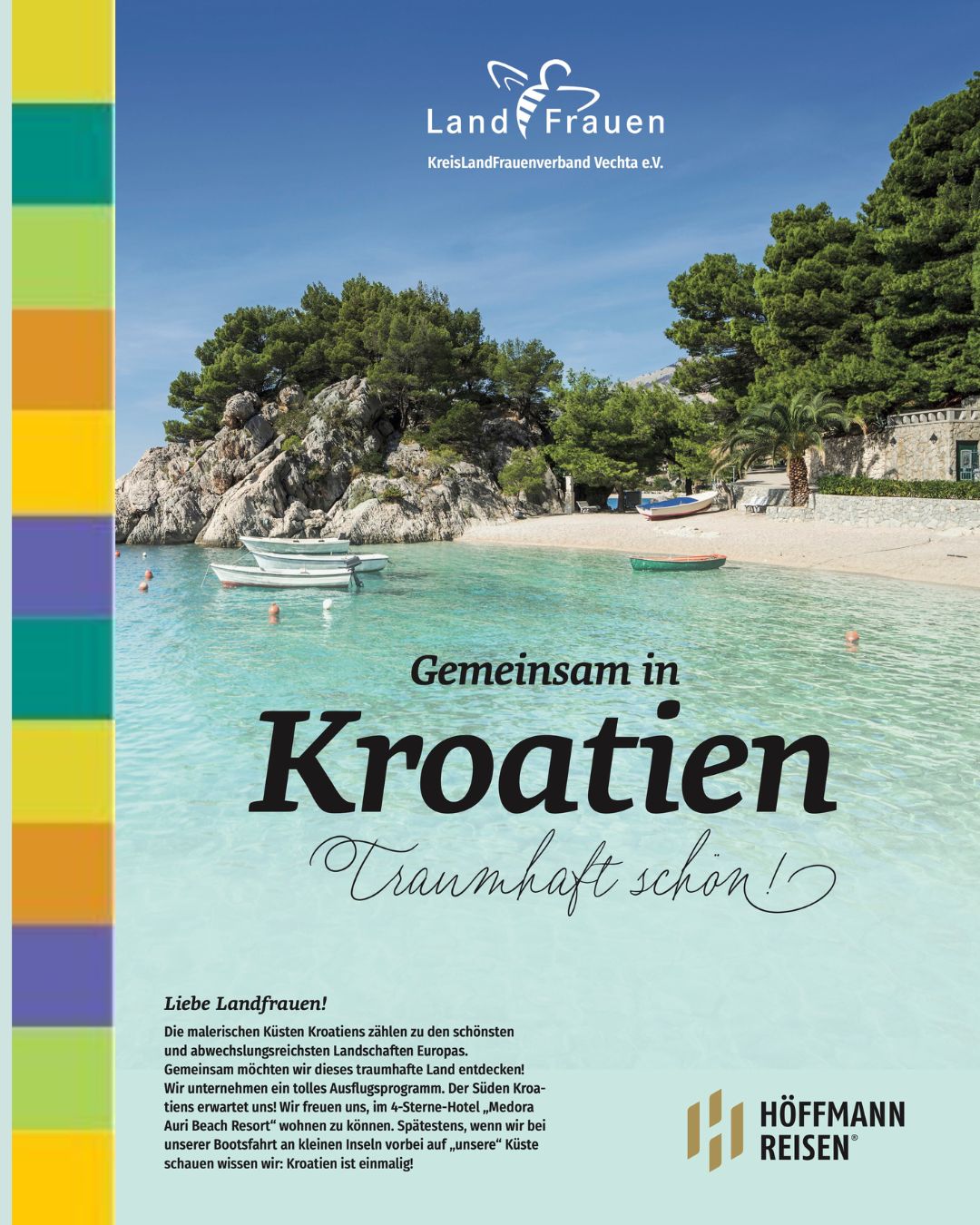 Eine Reise, die verbindet Die malerischen Küsten Kroatiens zählen zu den schönsten Landschaften Europas und genau dorthin reisen wir, der KreisLandFrauenverband Vechta e. V. im September 2026. Sieben Tage voller Eindrücke, Begegnungen und unvergesslicher Momente erwarten alle Landfrauen aus dem Landkreis Vechta, die Lust auf Meer, Kultur und Gemeinschaft haben. Komfortabel reisen…